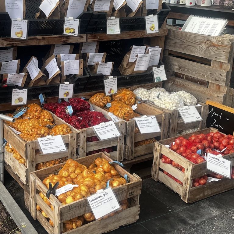 - Pflanzgut: Pflanzkartoffeln, Steckzwiebeln, Grüner Spargel ab April